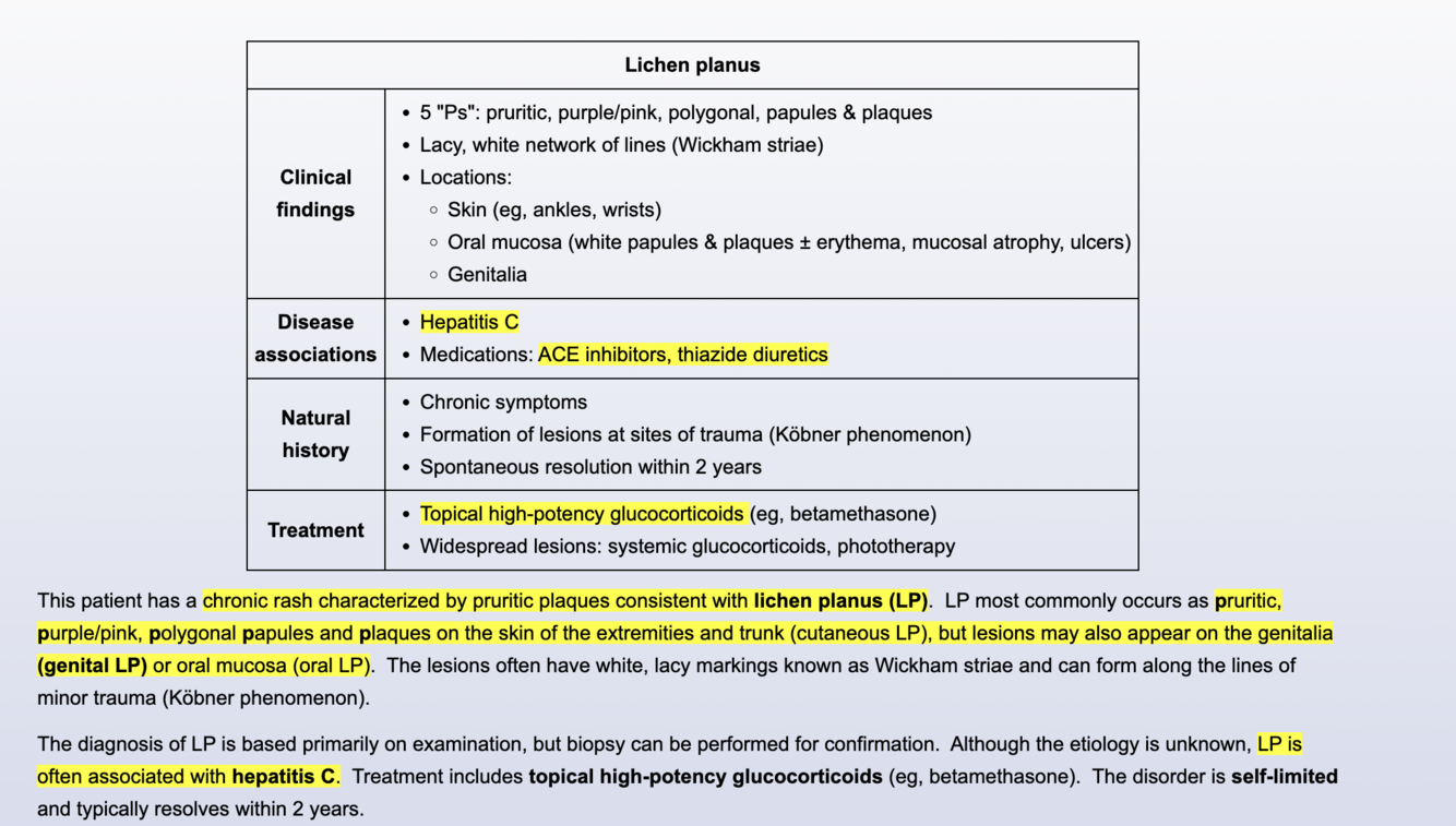 Drug-Induced LP (ACE, Thiazides) has a much more diffuse presentation than idiopathic LP (Wrist, Oral Mucosa, Genitalia)