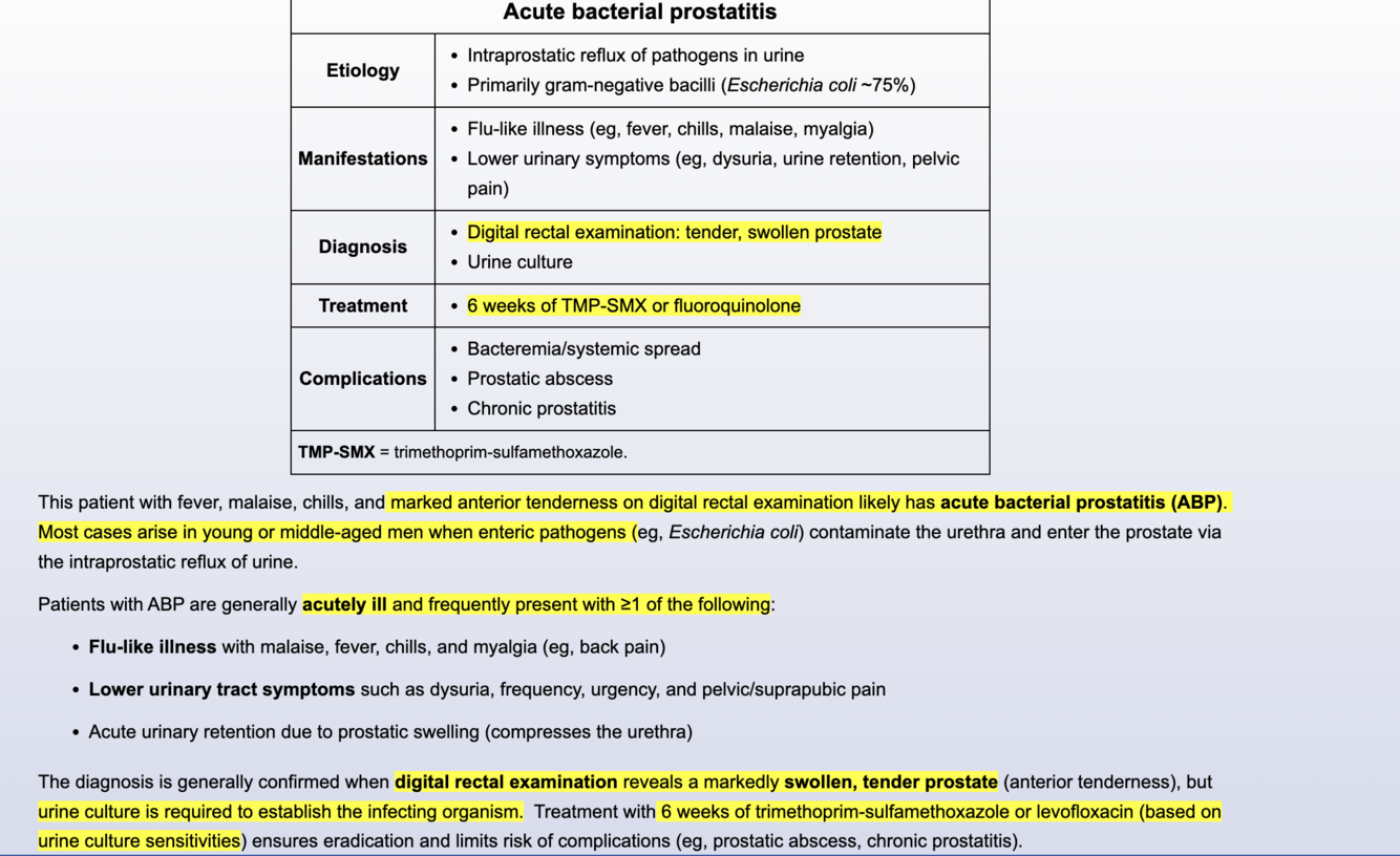 dx is generally confirmed with DRE showing markedly swollen & tender ANTERIOR prostate