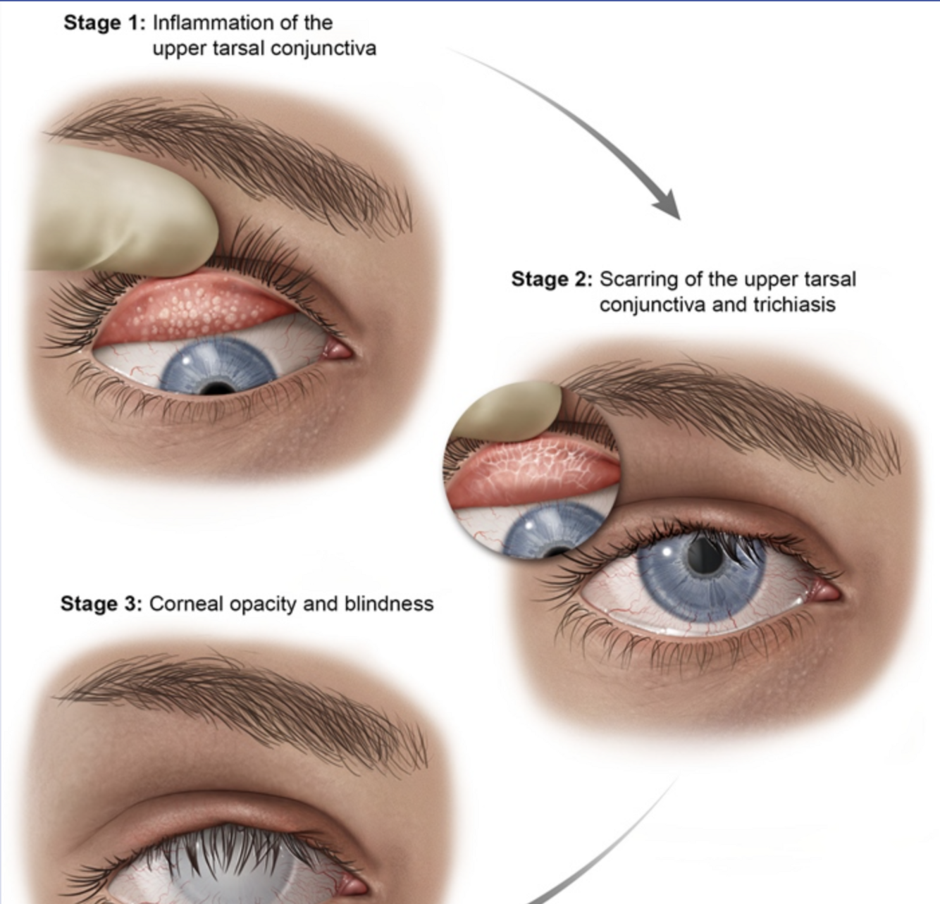 Chronic infection causes inversion of eyelashes (Trichiasis) & corneal scarring (blindness)