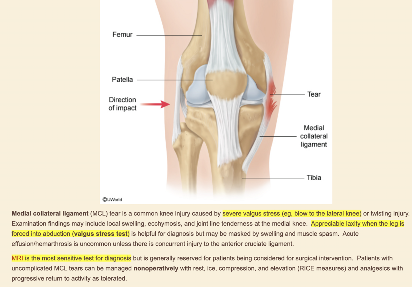 Appreciable laxity when the leg is forced into abduction (Valgus test)