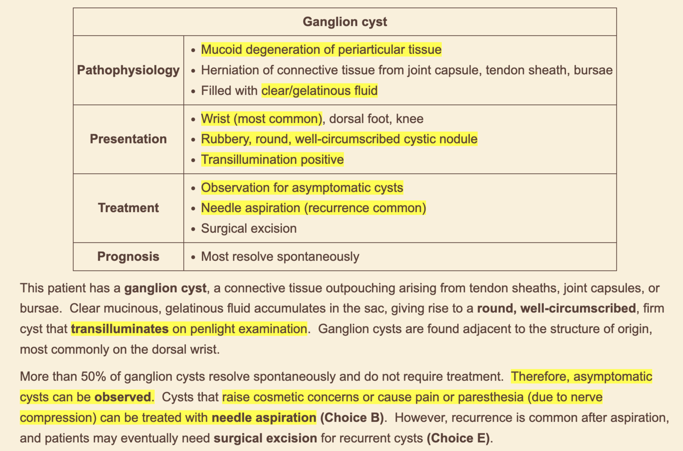 TX = Observation for asymptomatic cysts, can aspirate but associated w/ high degree of recurrence. Next step would be surgical excision