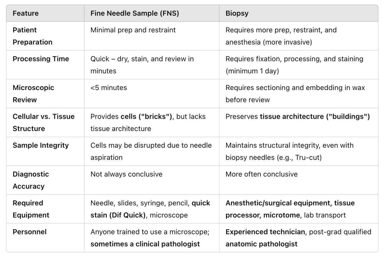Cells can often be safely retrieved from lesions near vulnerable structures in conscious animals, making anaesthesia & surgical biopsy unnecessary.