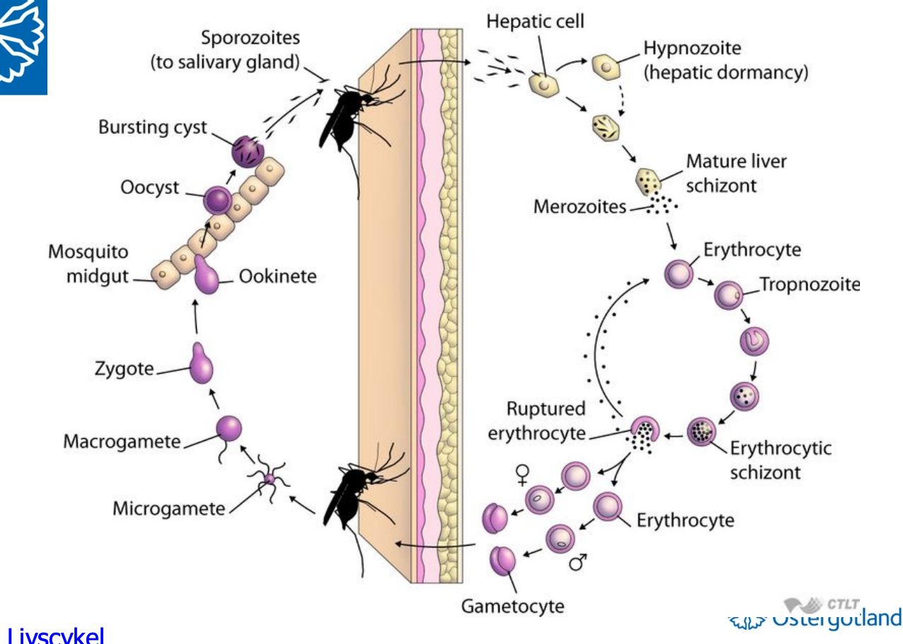 först till hepatocyter som sedan blir merozoliter som åker ut i blodbanan där erytrocterna blir infekterade. Dessa kan sedan påverka olika uvecklingtesg i erytrocyten.