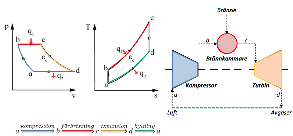 Hur ser en gasturbins process ut och hur ser p-v-diagramet och T-s-diagram ut?