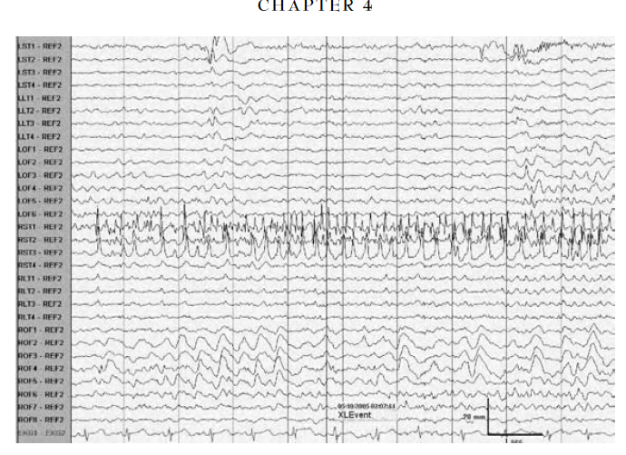 A frequent ictal pattern of mesial temporal origin is the sudden appearance of localized or regional background attenuation, build-up of 4- to 7-Hz rhythmic activity, increasing in amplitude as it slows to 1 to 2 Hz. This may befollowed by suppression or slow activity.