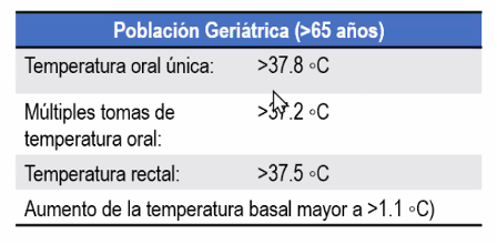 Temperatura población geriátrica: ORAL ÚNICA, MÚLTIPLES TOMAS, TEMPERATURA RECTAL, AUMENTO DE LA TEMPERATURA BASAL