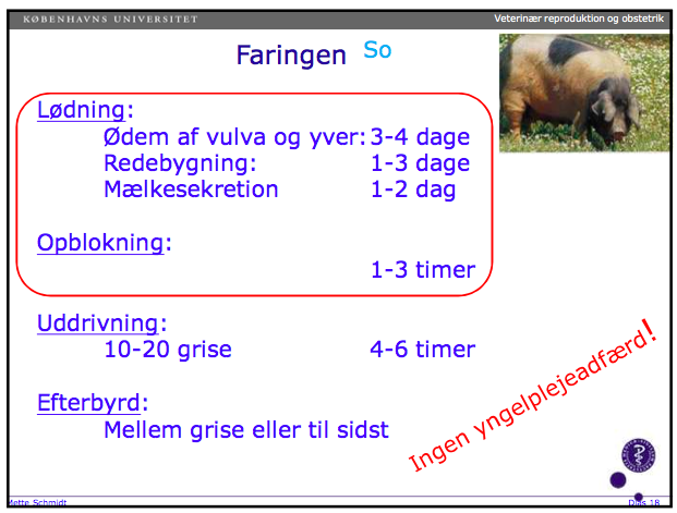 Hvornår sker de forskellige faser i fødslen hos søer og hvor lang tid tager de? (lødning, opblok, uddrivning og efterbyrd)