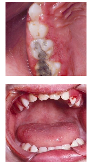 Swollen, red, and painful gums (gingiva) and mucosa, leading to discomfort and difficulty with oral function.