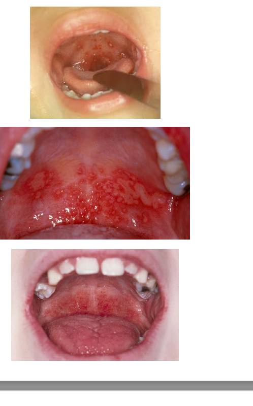 Primary Herpetic Gingivostomatitis: This condition causes swollen, painful gums (gingiva) and oral mucosa, along with small vesicles that become ulcers. The child may have fever, malaise, and difficulty eating or drinking.