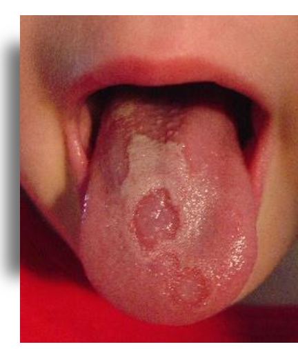 : A condition with smooth, red patches on the tongue that can change over time, often with raised white borders.