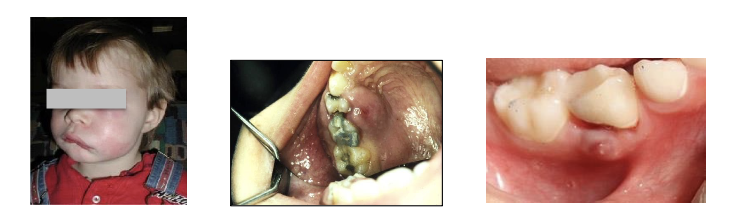 Odontogenic Infections: Acute infections present with fever, facial swelling, distress, and possible dehydration. Chronic infections may be asymptomatic but can cause a mobile or discolored tooth, halitosis, or a sinus tract.
