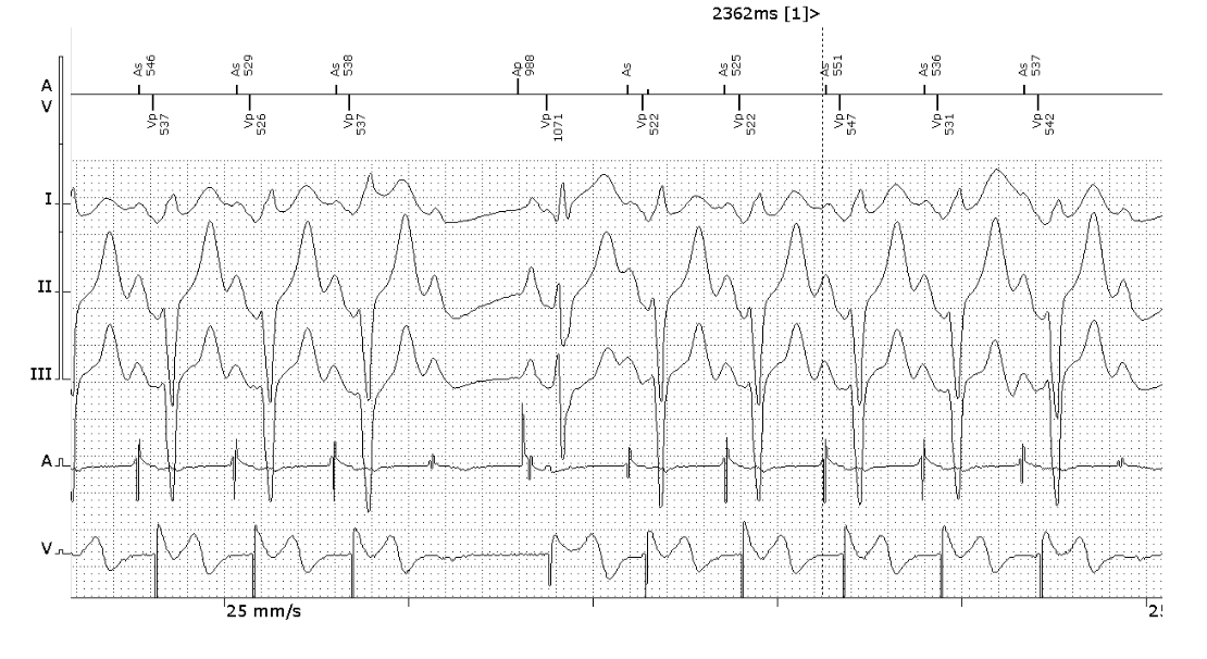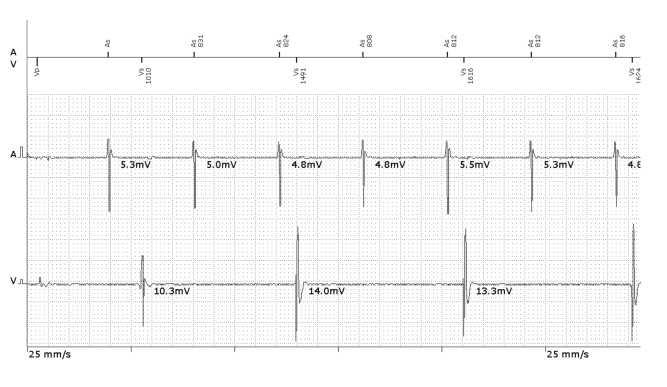 Although intrinsic rhythm is generally something to be preserved, an AV delay >450msec is unlikely to promote AV synchrony. Thus it is advisable to program normal physiological AV delays and increase V-pacing.