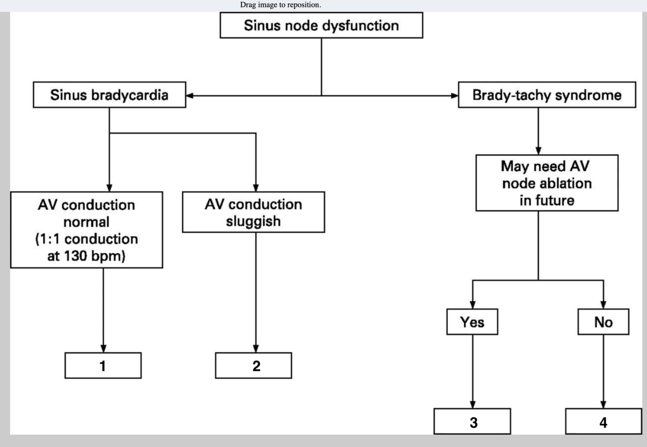 Rhythm shows good sinus function with 2:1 conduction. DDD will allow for appropriate sinus tracking and AV synchrony.