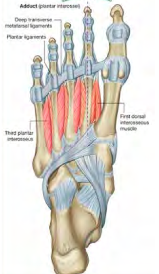 Interossei between bones: three plantar (adducting) and three dorsal (abducting)