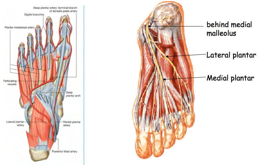 Behind medial malleolus > lateral plantar and medial plantar