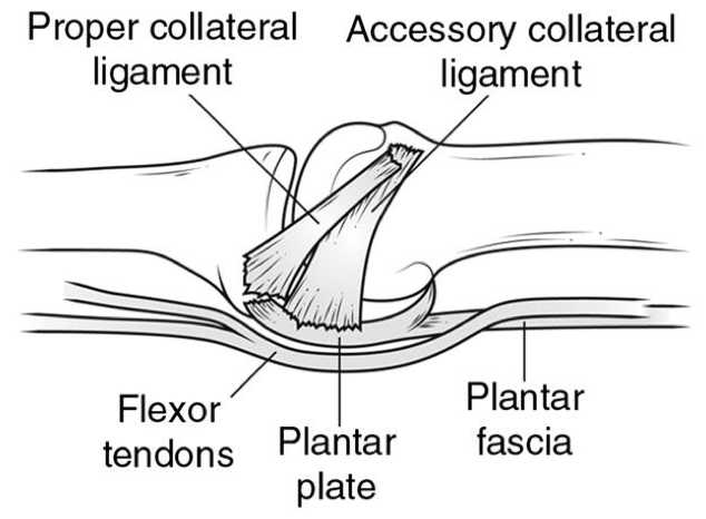 (vs. proper collateral, attaches to the proximal aspect of the phalanx)
