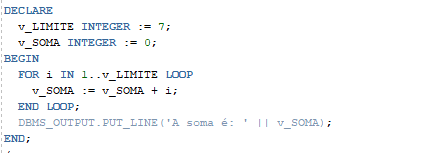 Imagine que você tem uma variável v_LIMITE com o valor 7. Como você usaria um loop FOR para calcular a soma dos números de 1 até v_LIMITE?