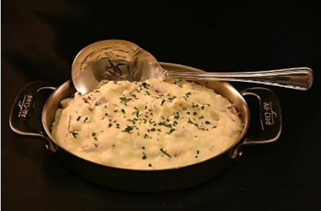 Classic combination of scalloped potatoes, cheese and cream baked in a shallow casserole, with a crisp topping of fried potatoes and fried onions.
