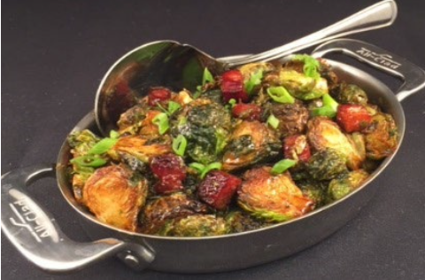 Crispy Brussels sprouts tossed with bacon lardons and a soy hoisin glaze
