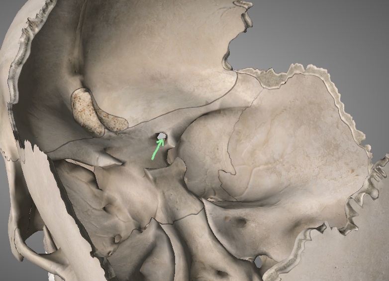 Middle cranial fossa - hiatus of lesser petrosal n. of temporal bone (lateral to greater)