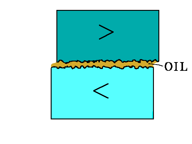 Lubricants, such as oil, reduce friction by filling in the gaps and stopping the rough surfaces from rubbing against each other.