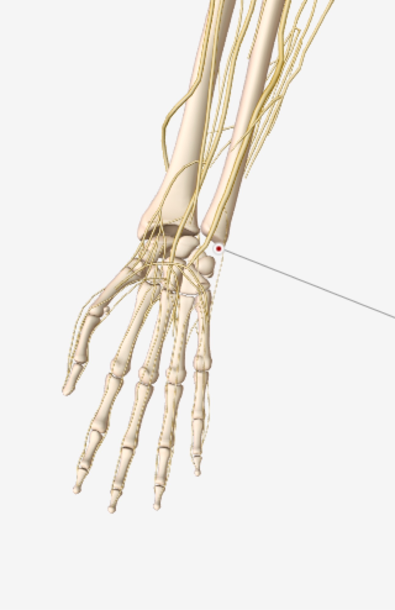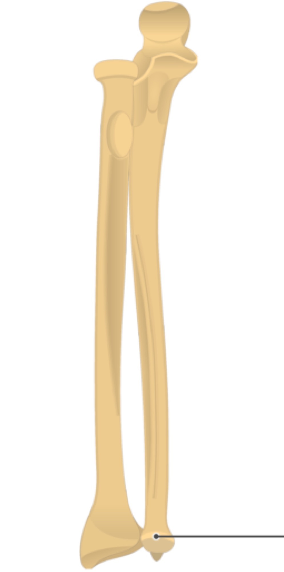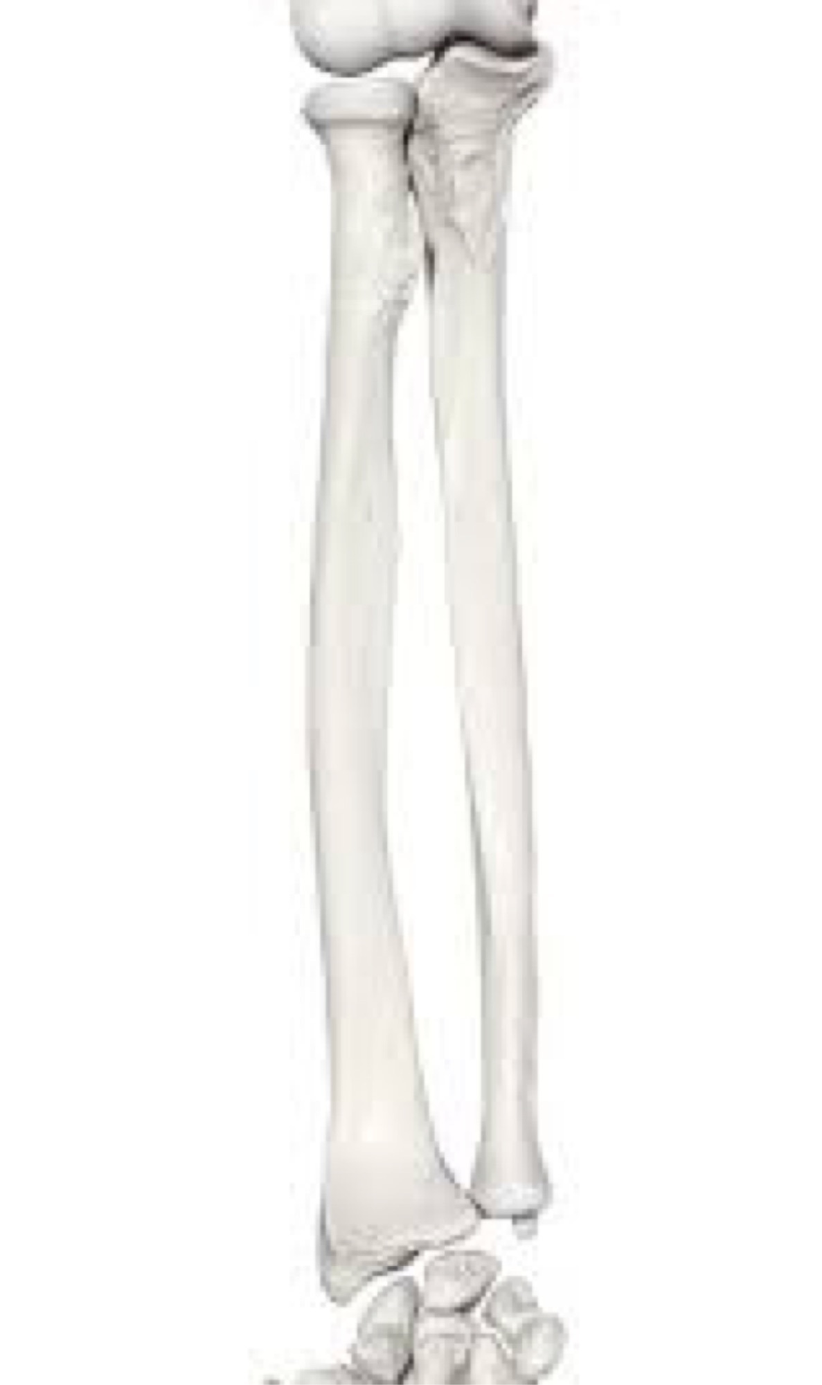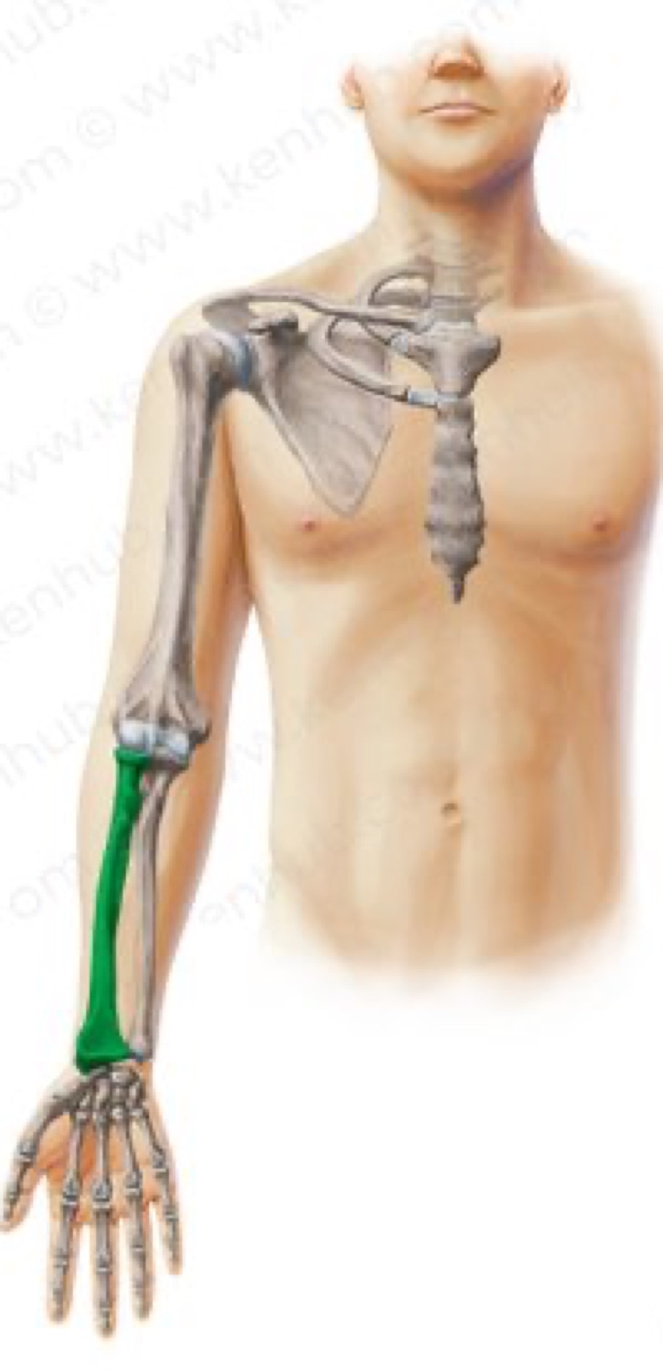Radial head (at the elbow) of the radius and radial styloid process (at the wrist) of the radius.