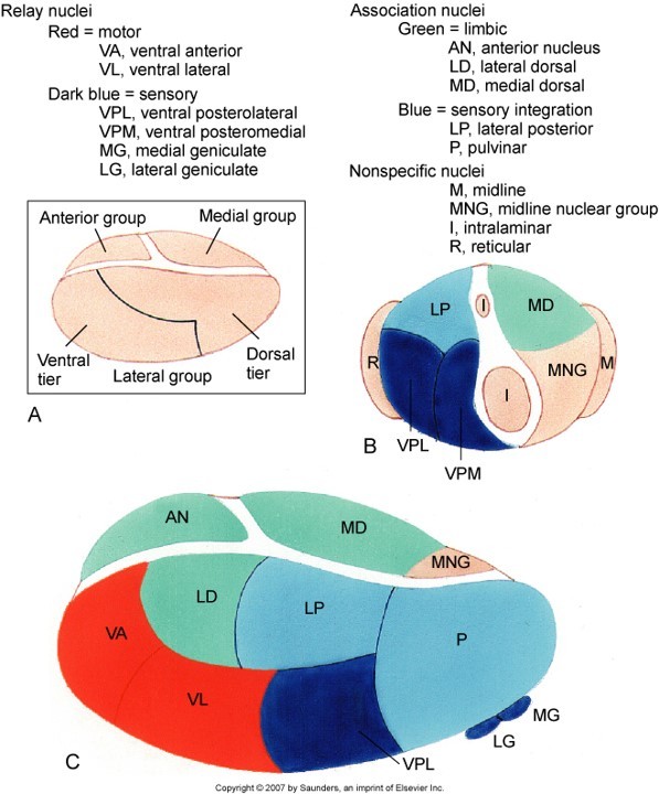 relay thalamic nuclei can be subdivided by whether it is motor or sensory relays. List the portion of the thalamus that is responsible for each