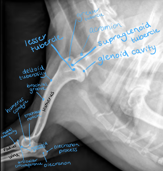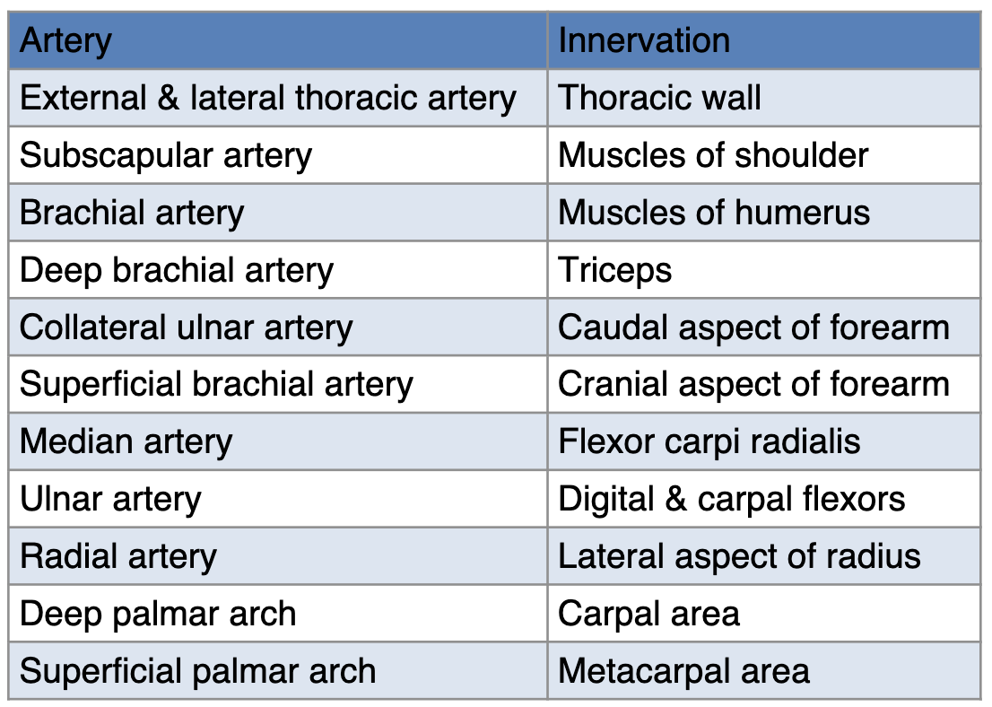 Lies beneath muscles of shoulder & runs down forelimb
