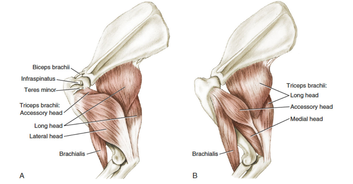 b) the triceps has a lateral head, a medial head, a long head and an accessory head