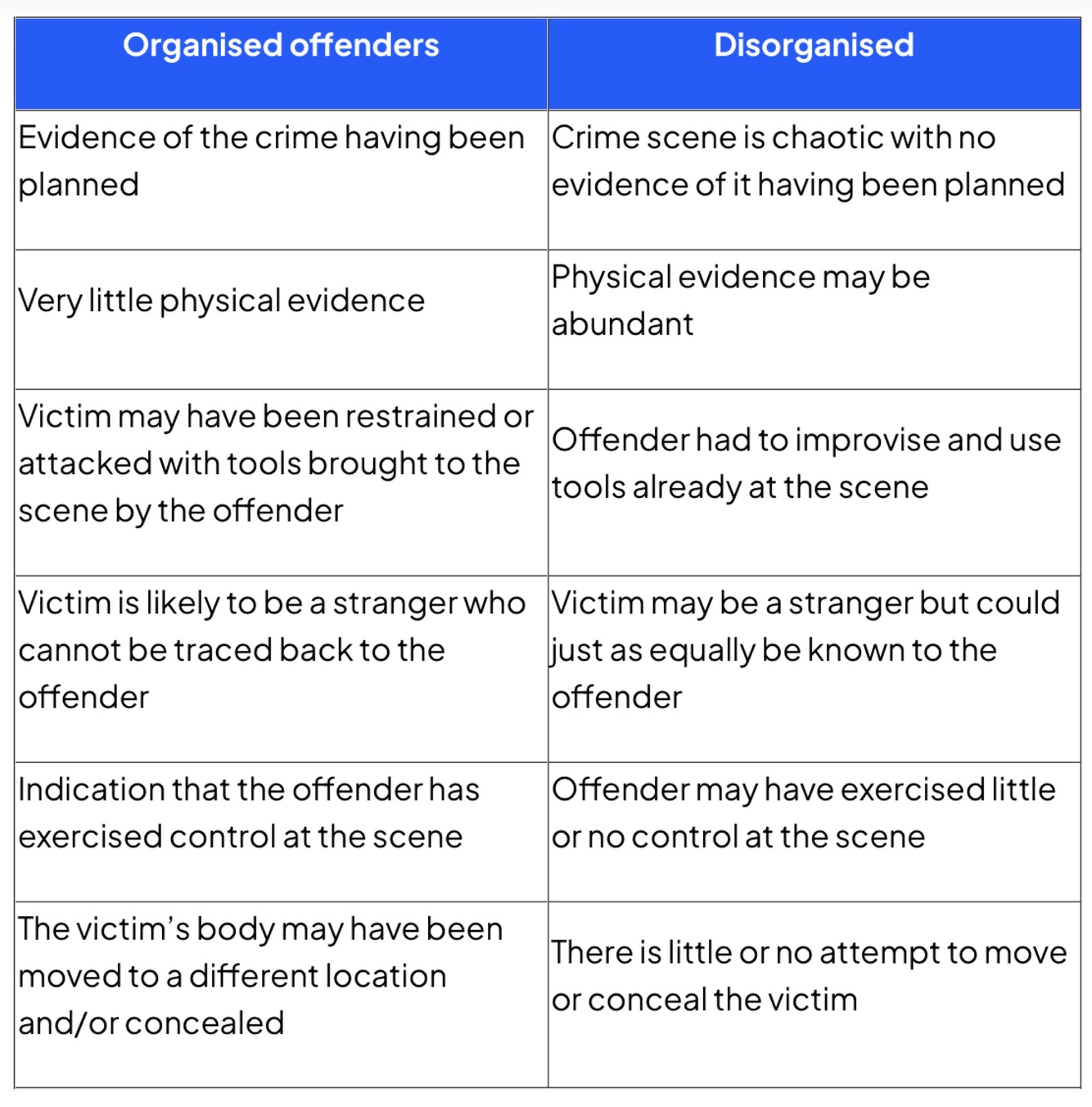 criminal characteristics (characteristics about the offender can help to classify them, which helps the police investigation).