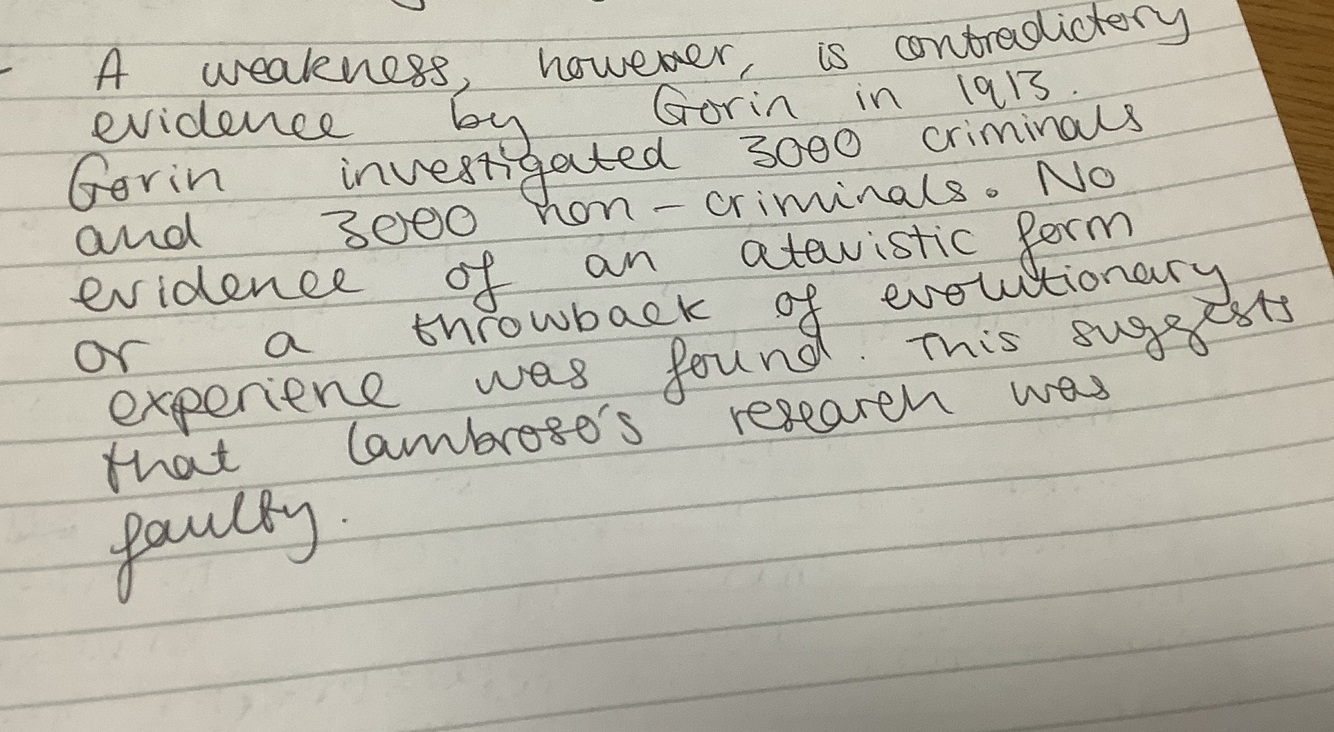 – Lambroso’s research: Lambroso examined the facial and cranial features of thousands of Italian conflicts, both living and dead, and proposed that the atavistic form was associated with a number of physical anomalies which are key indicators of criminality. He concluded that 40% of criminal acts could be accounted for by atavistic characteristics. He didn’t use a control group to compare.