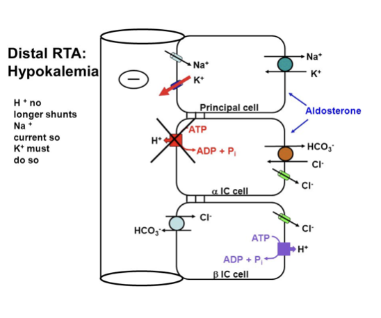 Decreased capacity to resorb HCO3- at proximal tubule resulting in increased K+ secretion at DCT as compensatory mechanism