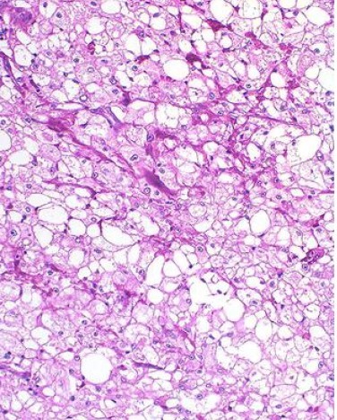 RCC typically occurs with contrast-enhanced CT scan or MRI and is confirmed by biopsy at the time of nephrectomy. Biopsy of RCC is uniquely characterized by polygonal clear cells: because of the accumulation of lipid and carbohydrate content in the cells. It spreads hematogenously and commonly presents as a metastatic neoplasm. The brain and lung are frequent sites of metastasis.