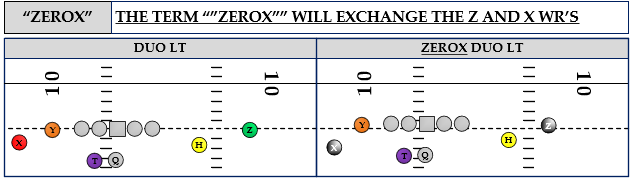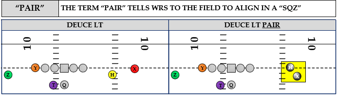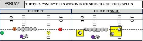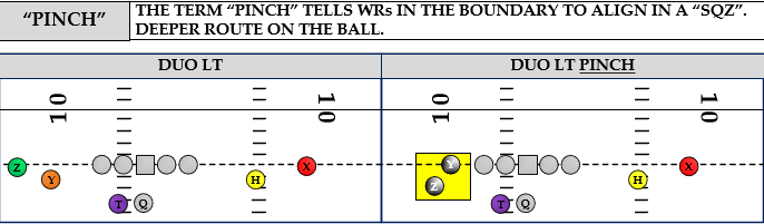 TELLS WR’s IN THE BOUNDARY TO ALIGN IN A “SQZ”. DEEPER ROUTE ON THE BALL
