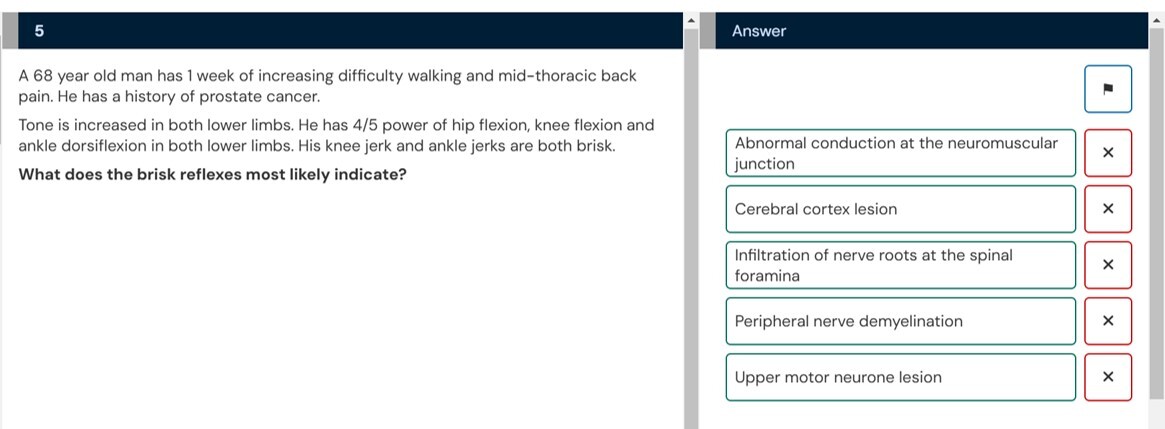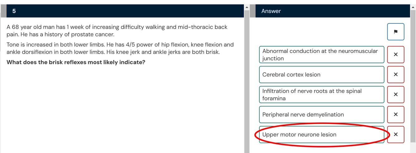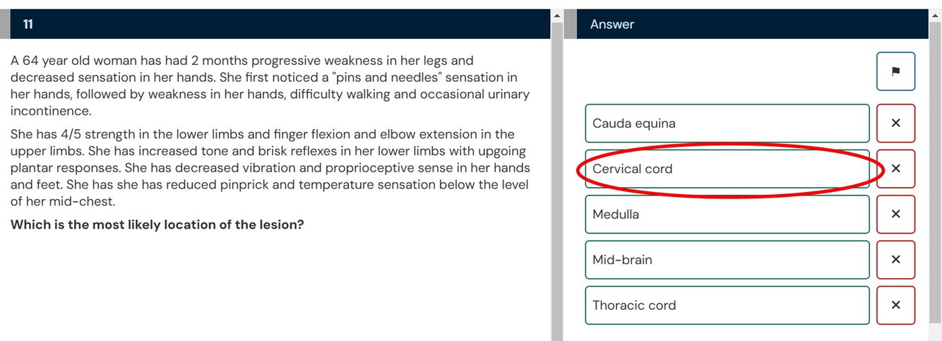 She has a broad based gait and increased tone in her right leg and arm with hyper-reflexia. Her Montreal Cognitive Assessment Score is 22/30.