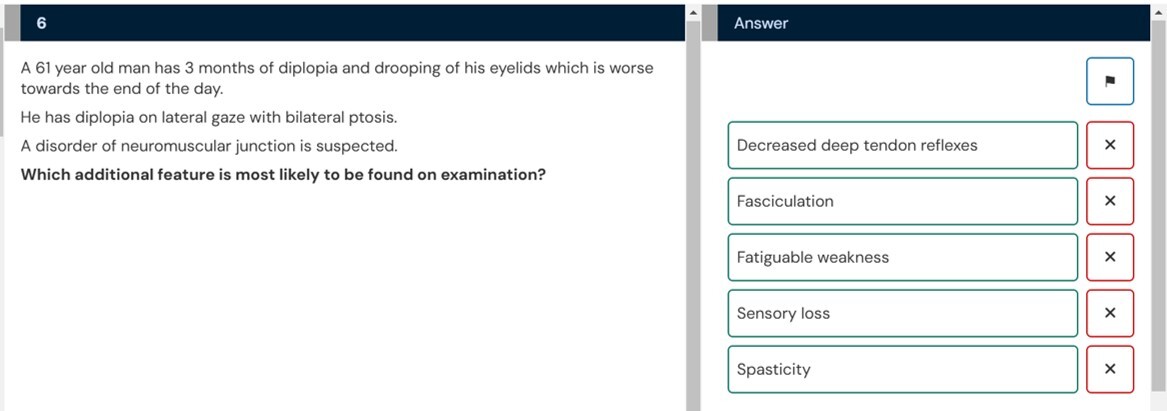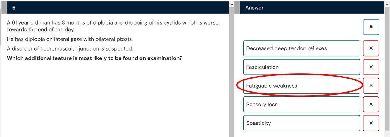Answer: C. Neuromuscular junction weakness classically is fatiguable, due to depletion in the available