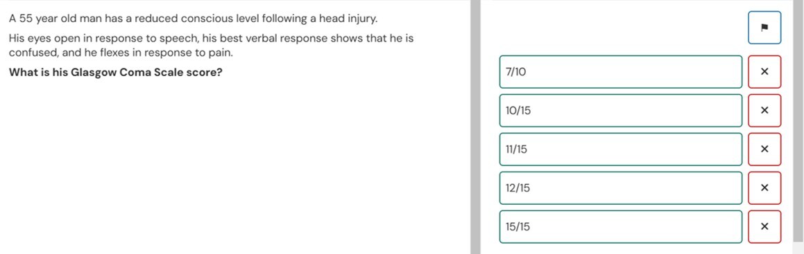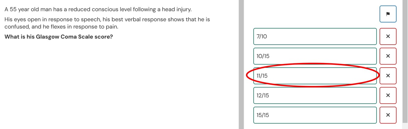 His GCS score is 11/15 E3 V4 M4 The GCS is scored out of 15. The lowest score possible is 3. A