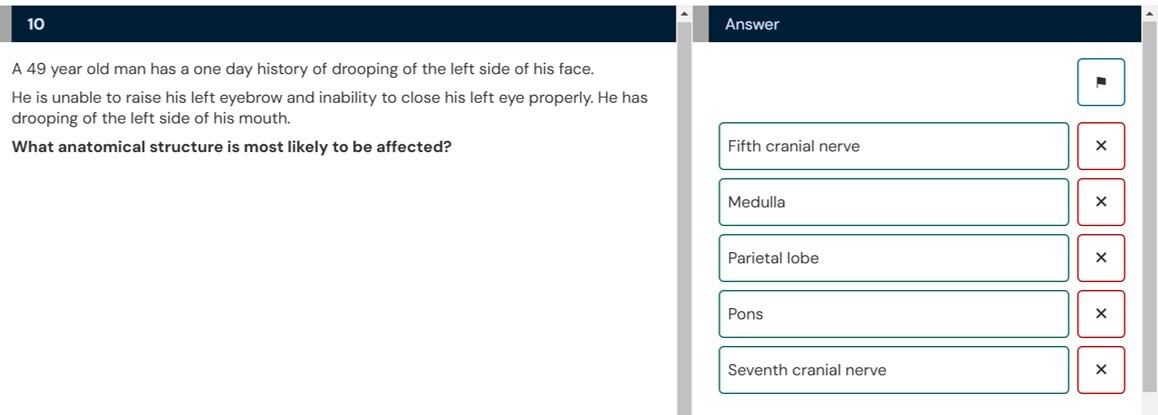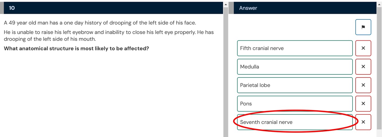 This patient is suffering from a Bell’s palsy which involves the facial nerve (cranial nerve VII). This involves