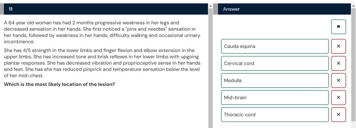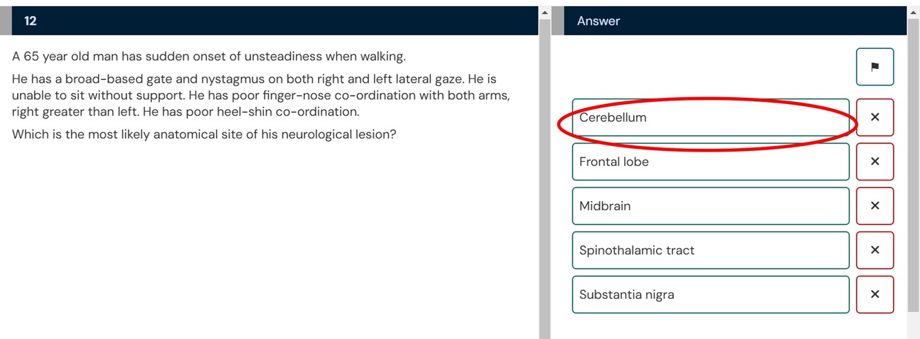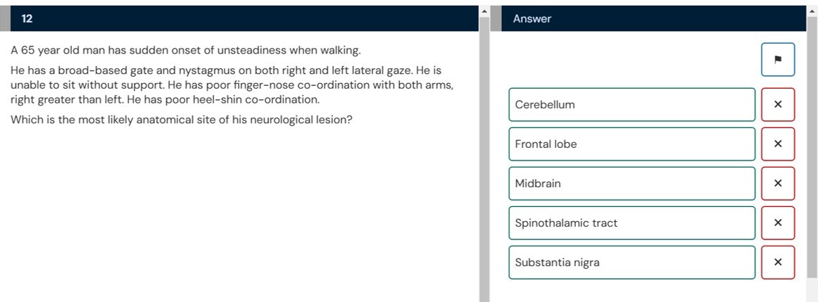 This patient has presented with classic cerebellar signs (ataxia, broad-based gait, nystagmus and poor