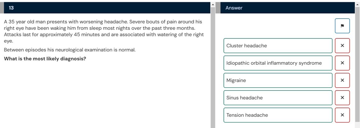 more common in the night time and waking the patient from sleep, is also consistent with cluster headaches.