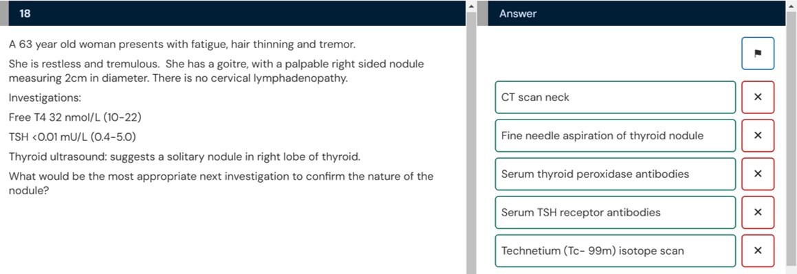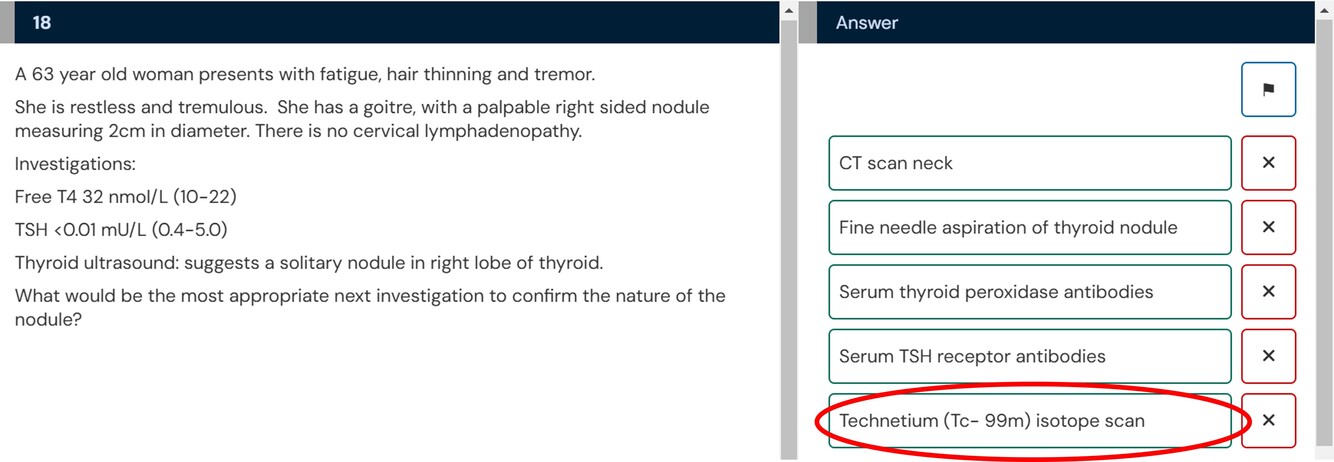 aspiration would only be appropriate if this was a ‘cold’ nodule. Ultrasound of antibody measurement would not be helpful in determining the functionality of the nodule as we can assume it’s not’s gaves because the goitre is not smooth.