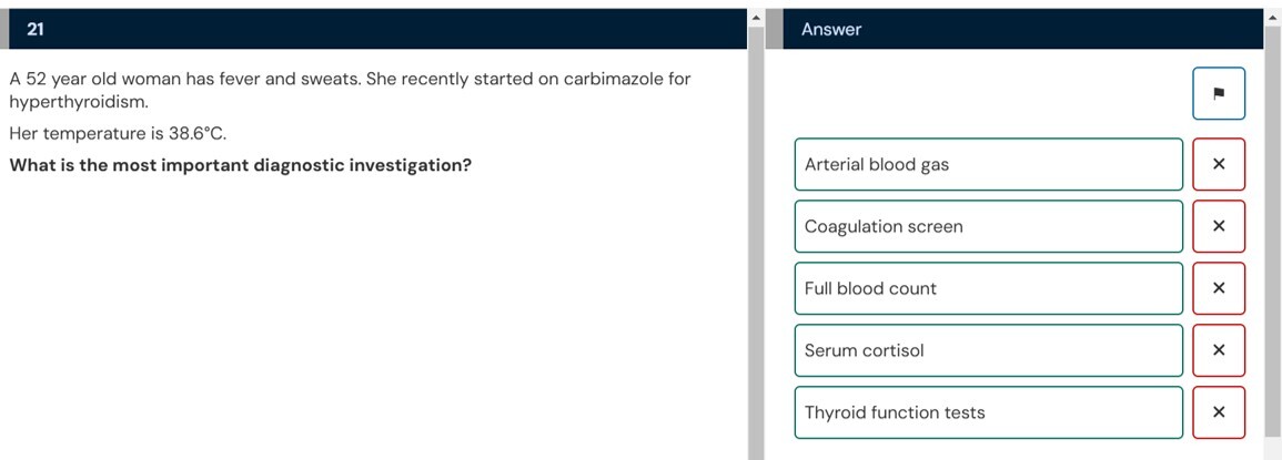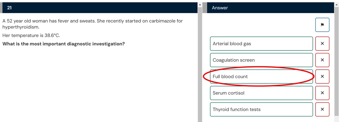 Carbimazole can cause agranulocytosis (low white cells) so a full blood count should be ordered in an acutely unwell patient.