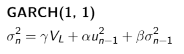 Multiply gamma with long term variance + alpha * pervios return^2 + beta * Previous variance