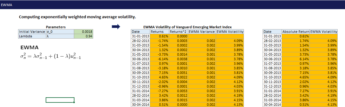 What is the formula of Computing exponentially weighted moving average volatility (EWMNA)