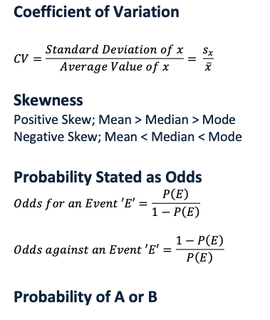 Coefficient of variation, order of MMM for skewness, probability stated as odds