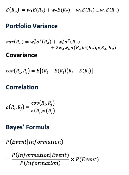 Portfolio E(r), Portfolio variance, covariance, correlation, bayes formula