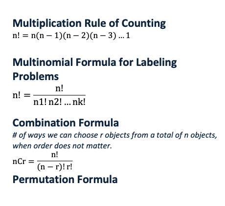 Multiplication rule of counting, multinomial formula for labelling problems, combinaiton formula (# ways choose r from n) when order not matter
