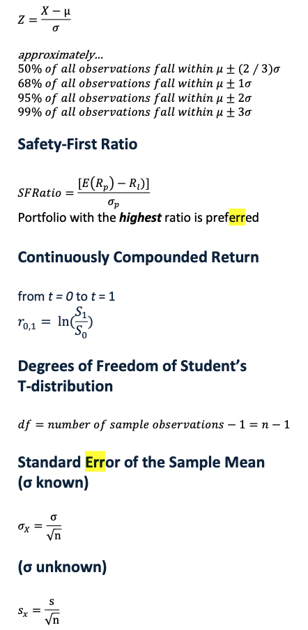 Standardizing a random normal variable and % within Stdevs, Safety-First Ratio, Degrees of Freedom of Student’s T-distribution, Standard Error of the Sample Mean (known and unknown pop variance)
