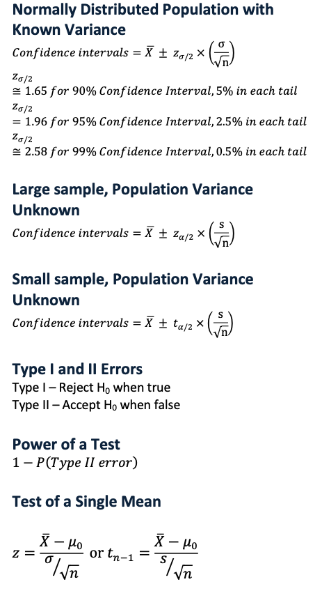 CI formula and common Z-values, CI with small and large sample, Type 1 and 2 errors, power of a test, test of single mean