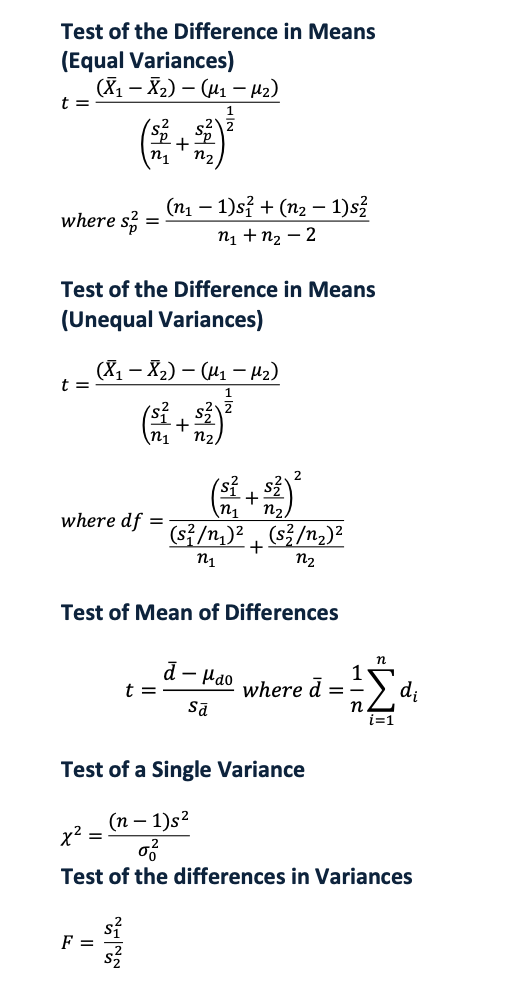Test of diff in means (equal variances), Test of the Difference in Means (Unequal Variances), Test of Mean of Differences, Test of a Single Variance, Test of the differences in Variances